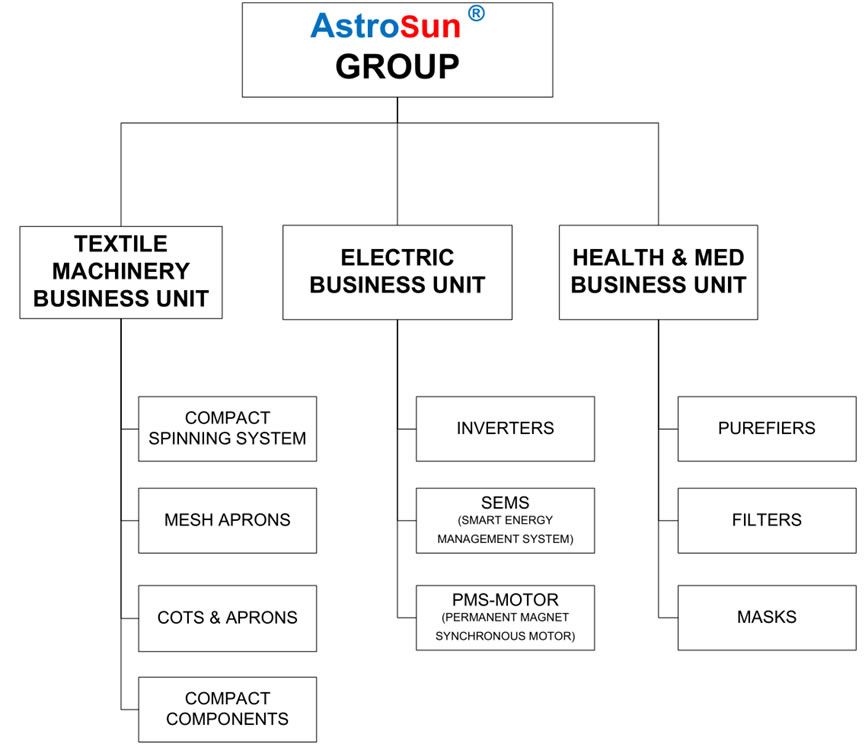 Astrosun Group has three business units(,): Textile Machinery BU, Electric BU and Energy BU. Please see below overview about detailed products in each BU.